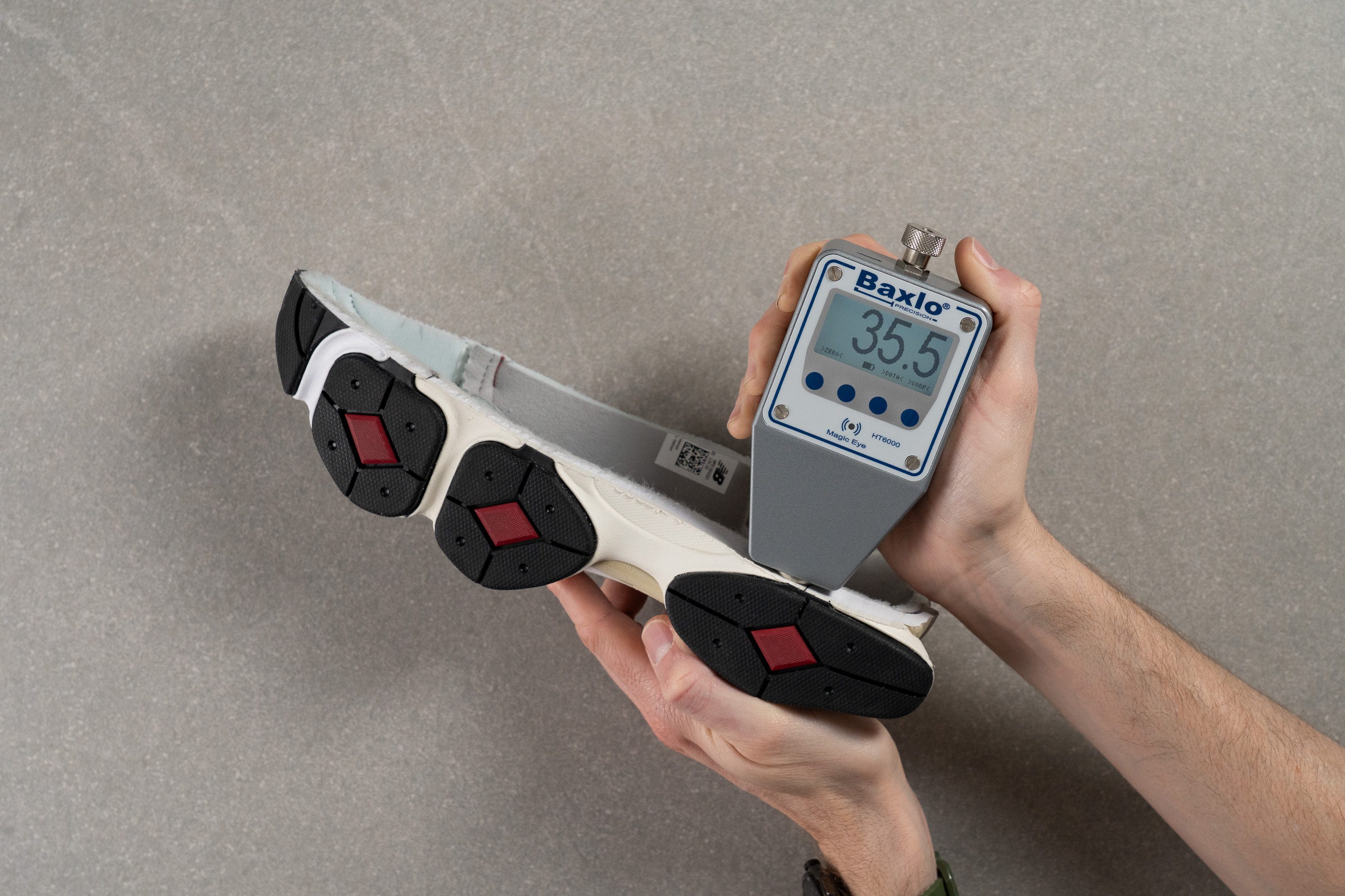 Analizamos la espuma de cada modelo con un durómetro Asker C. Nos ayuda a clasificar las zapatillas de la marca por el nivel de firmeza.