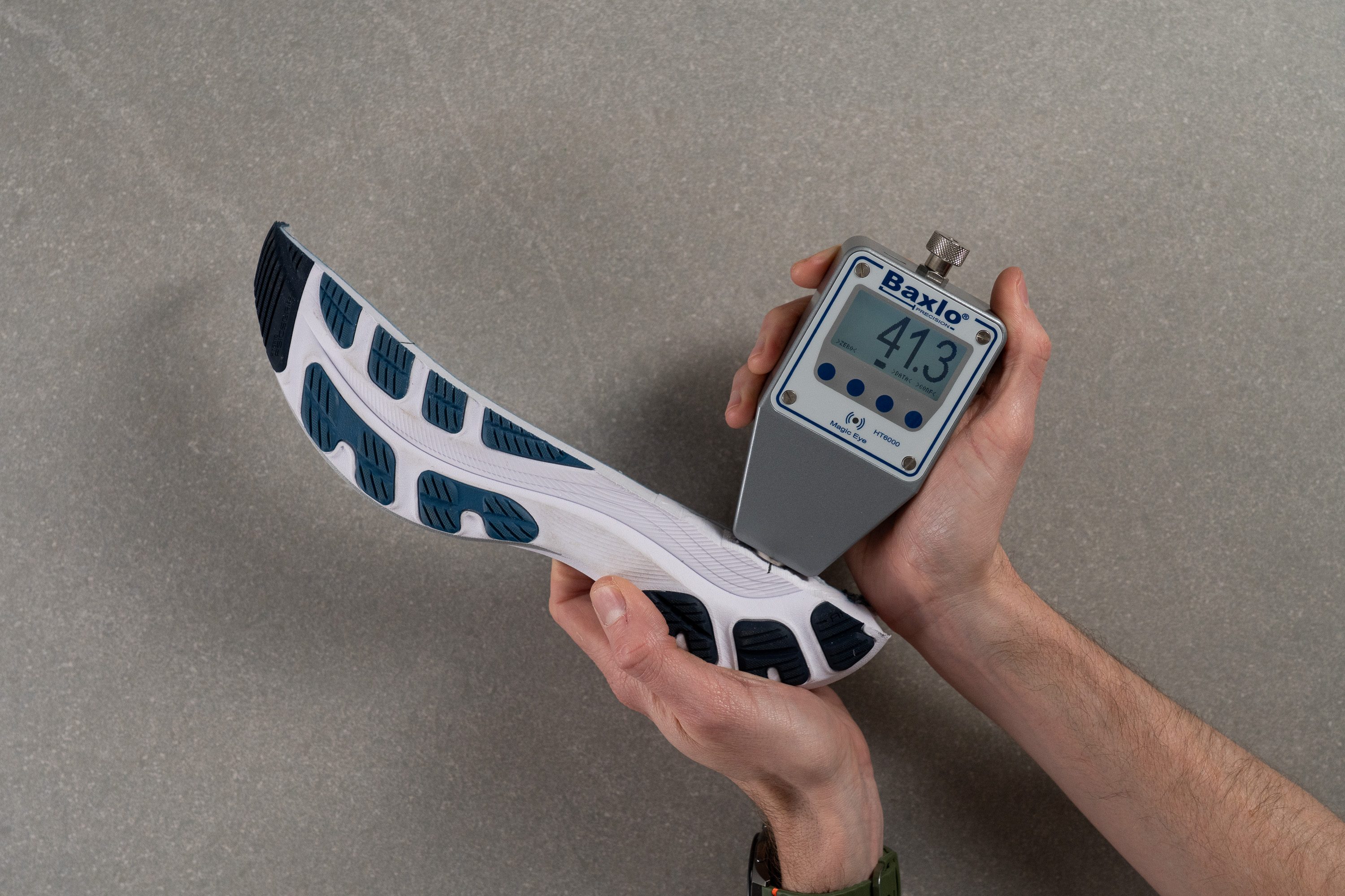 En nuestro laboratorio, medimos lo blandas que son las dos mediasuelas presentes (lo explicaremos más adelante).