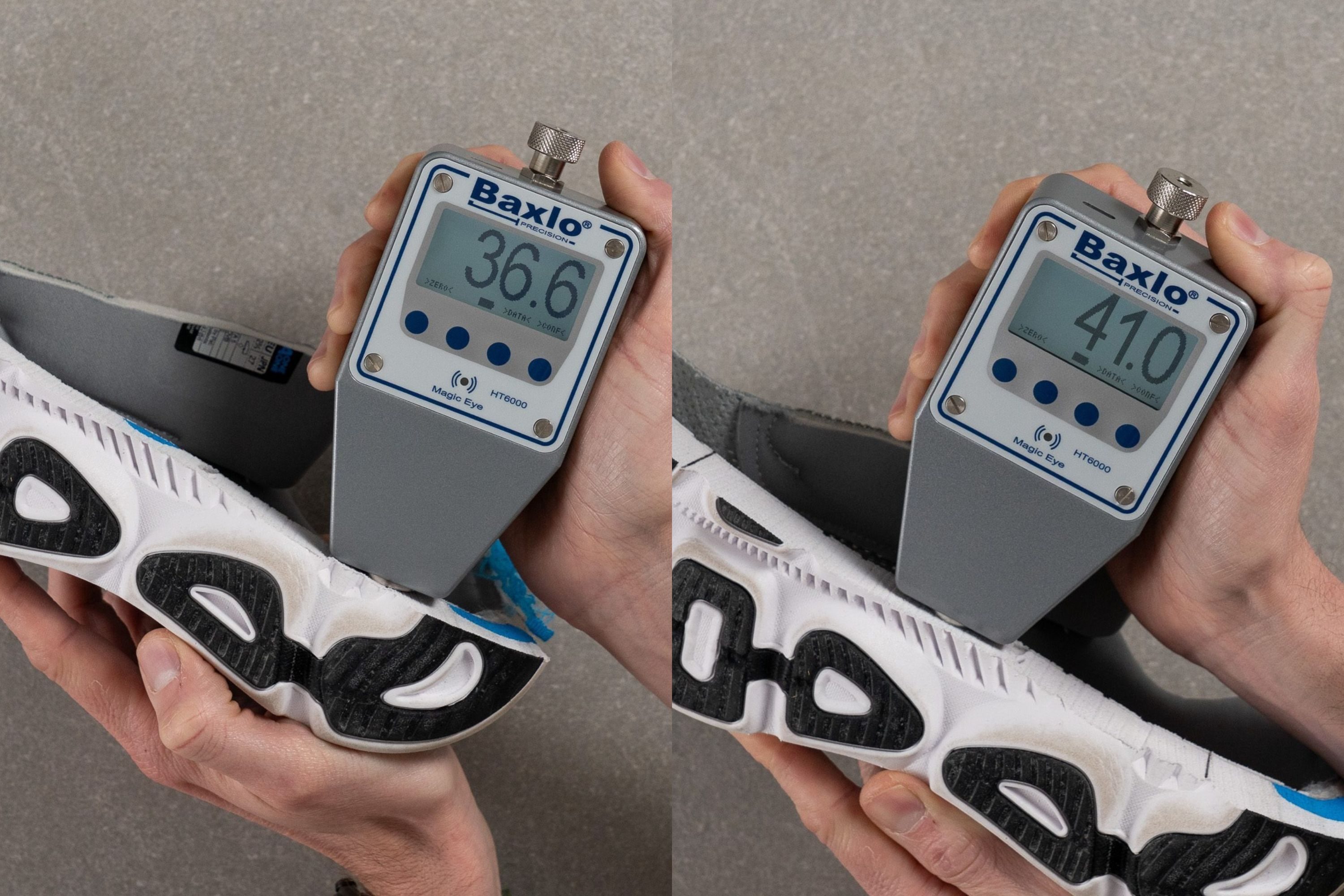 Cuanto más bajo sea el número que marca el durómetro, más blanda será la espuma, pero también es importante tener en cuenta la absorción de impactos. Lo blanda que es la espuma nos indica justo eso: cómo de blanda es la mediasuela. La absorción de impactos, por otro lado, nos dice cómo de protectora es la mediasuela. Es decir, cómo de bien se le da amortiguar el impacto al aterrizar. Lo ideal es que la mediasuela absorba el máximo impacto posible para que estas fuerzas no se transmitan a las piernas.