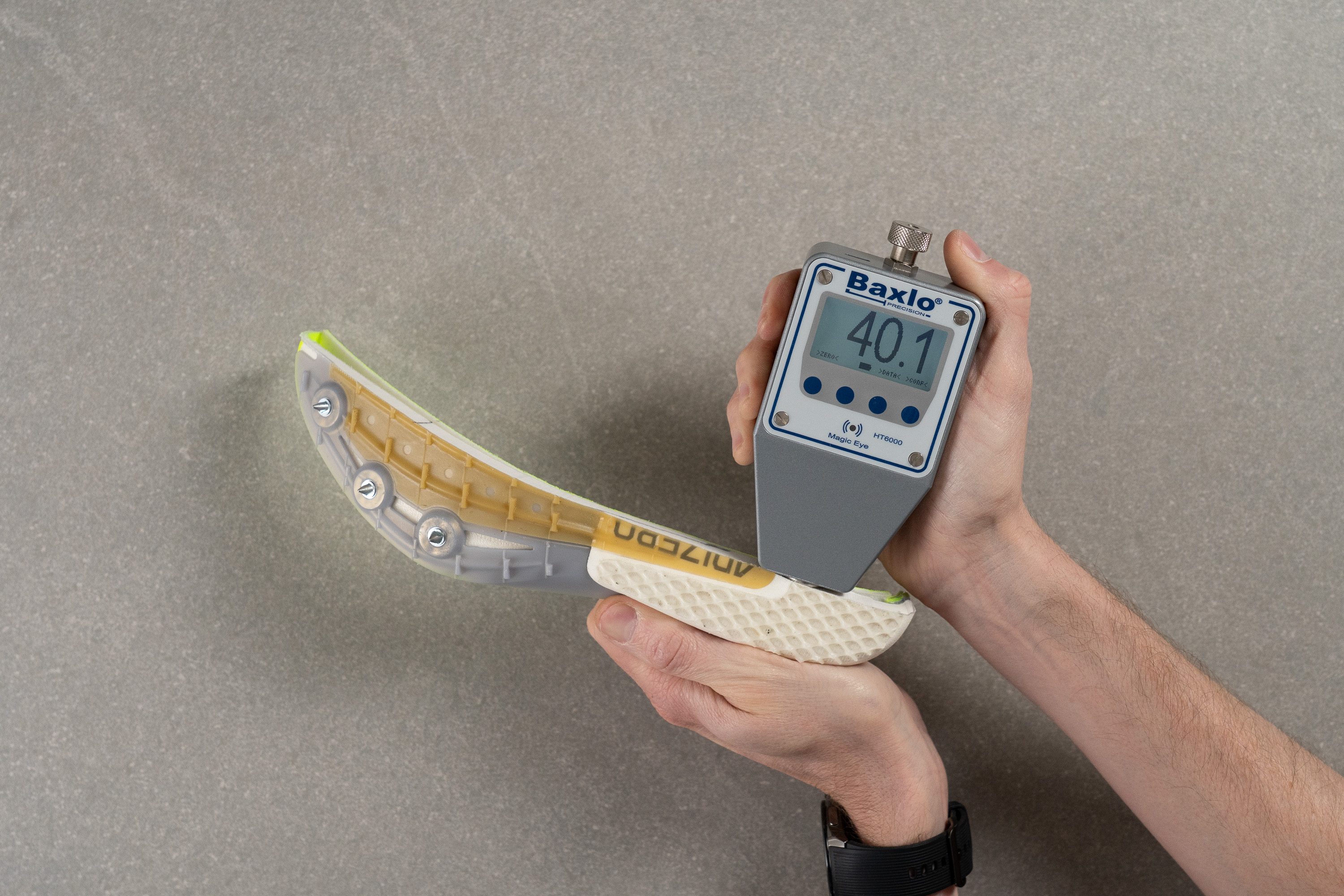 We then use an Asker C durometer to measure the midsole softness. The lower the number on the digital display, the softer the midsole in XC shoes.