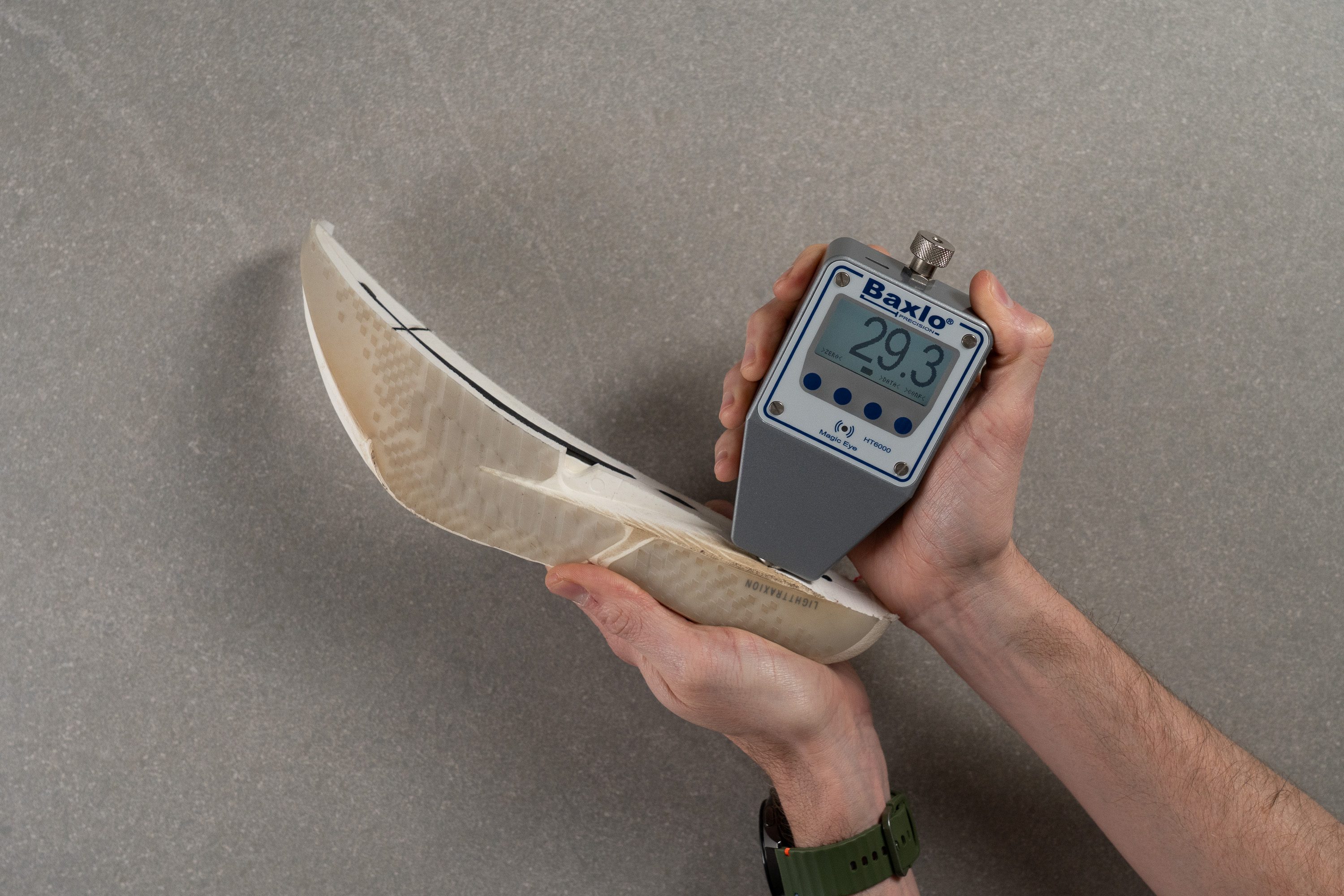 When it comes to softness, we measure it after cutting the shoes in half. This allows us to take the proper measurements as doing it on a whole shoe by sticking the durometer needle on the outside leads to inaccurate measurements.