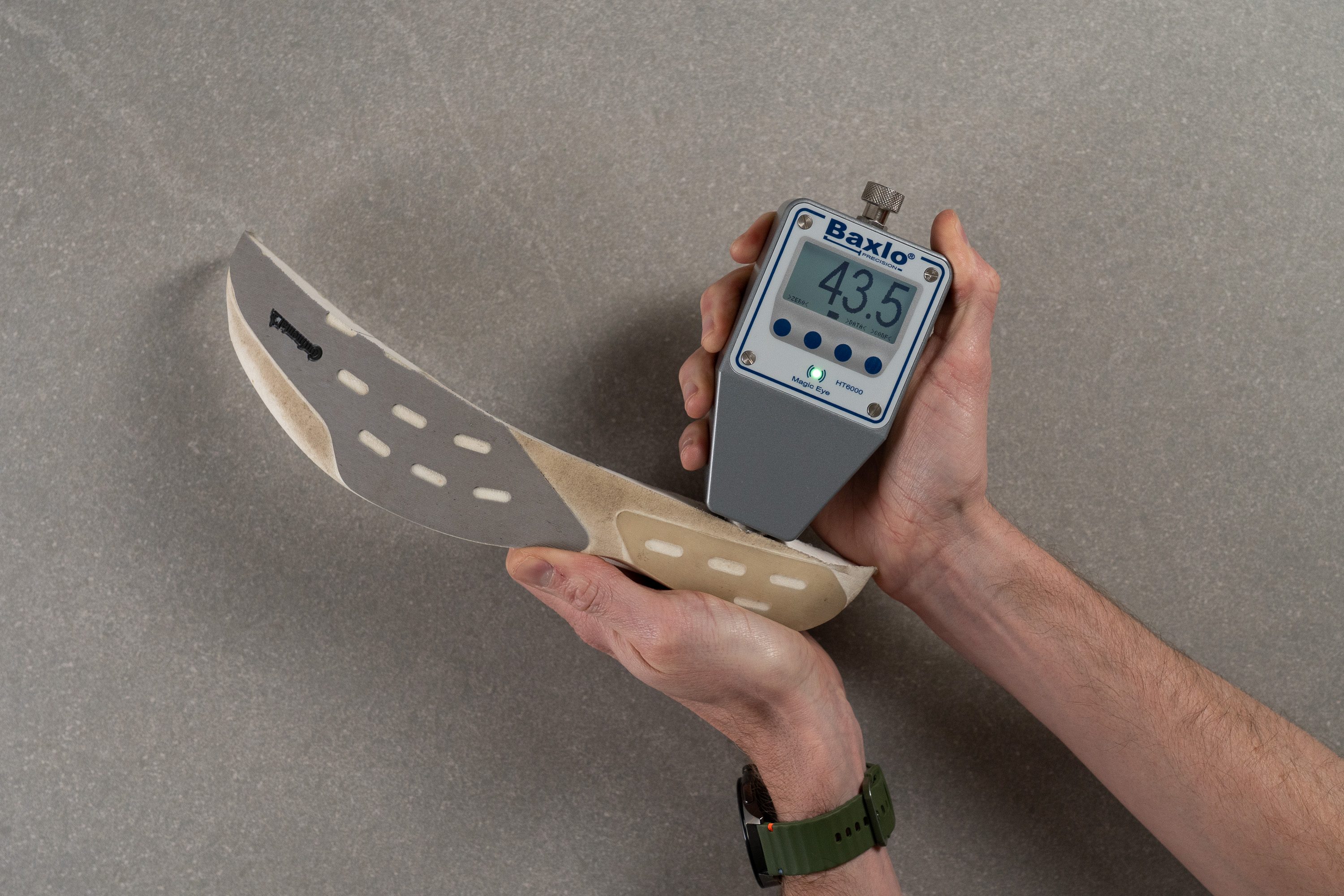 We also measure the thickness of the outsole. We use a digital caliper to do so.