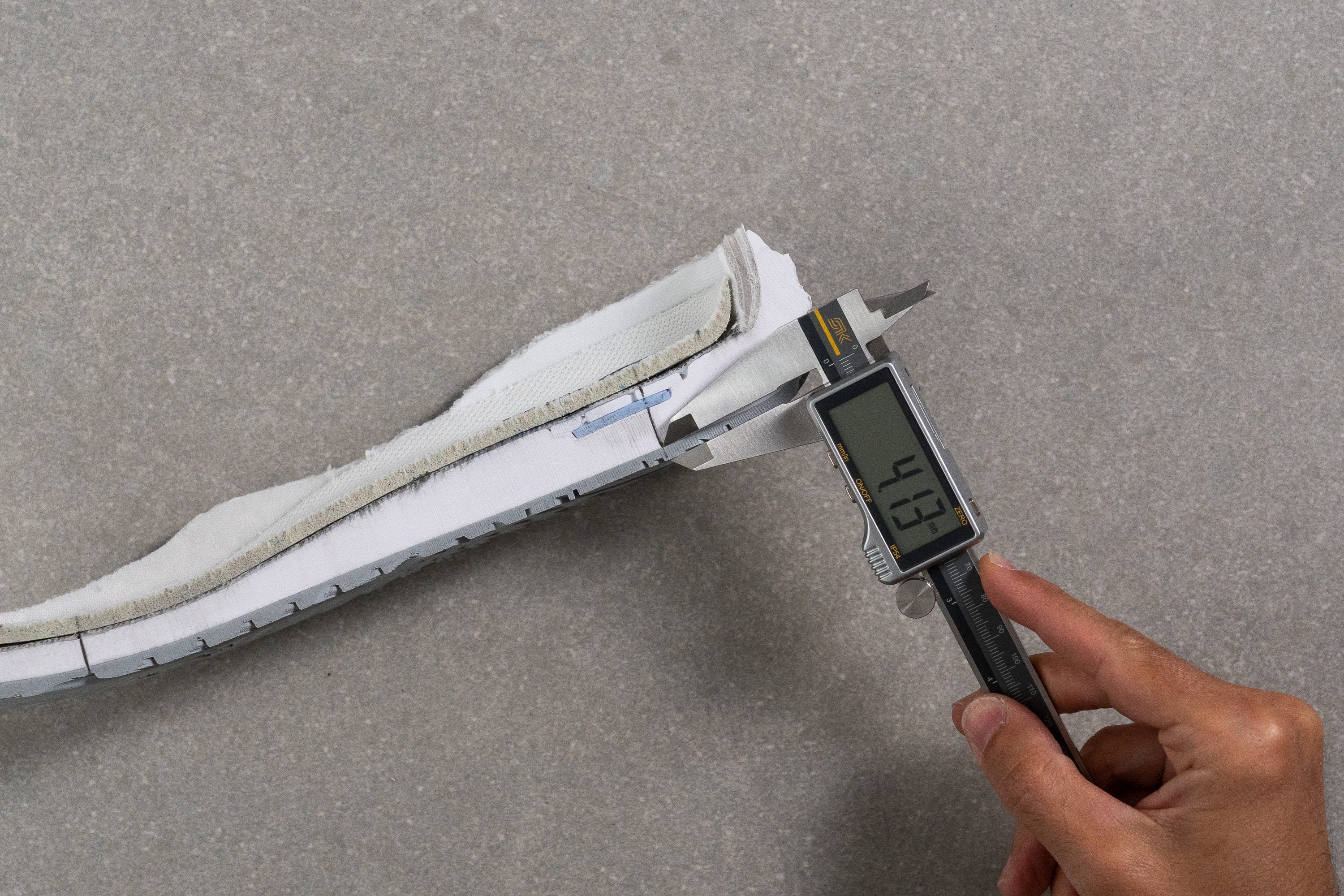 We also measure the outsole thickness of each tennis shoe with a digital caliper to check how much rubber it packs. The thicker the outsole, the longer the lifespan.