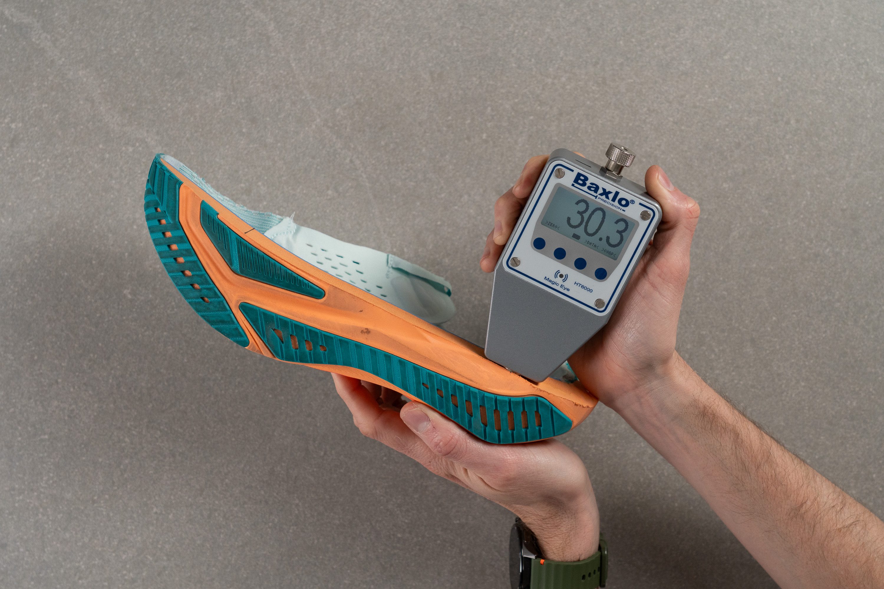 In our shoe lab, we measure the stack heights according to the WorldAtlhetics guidelines.