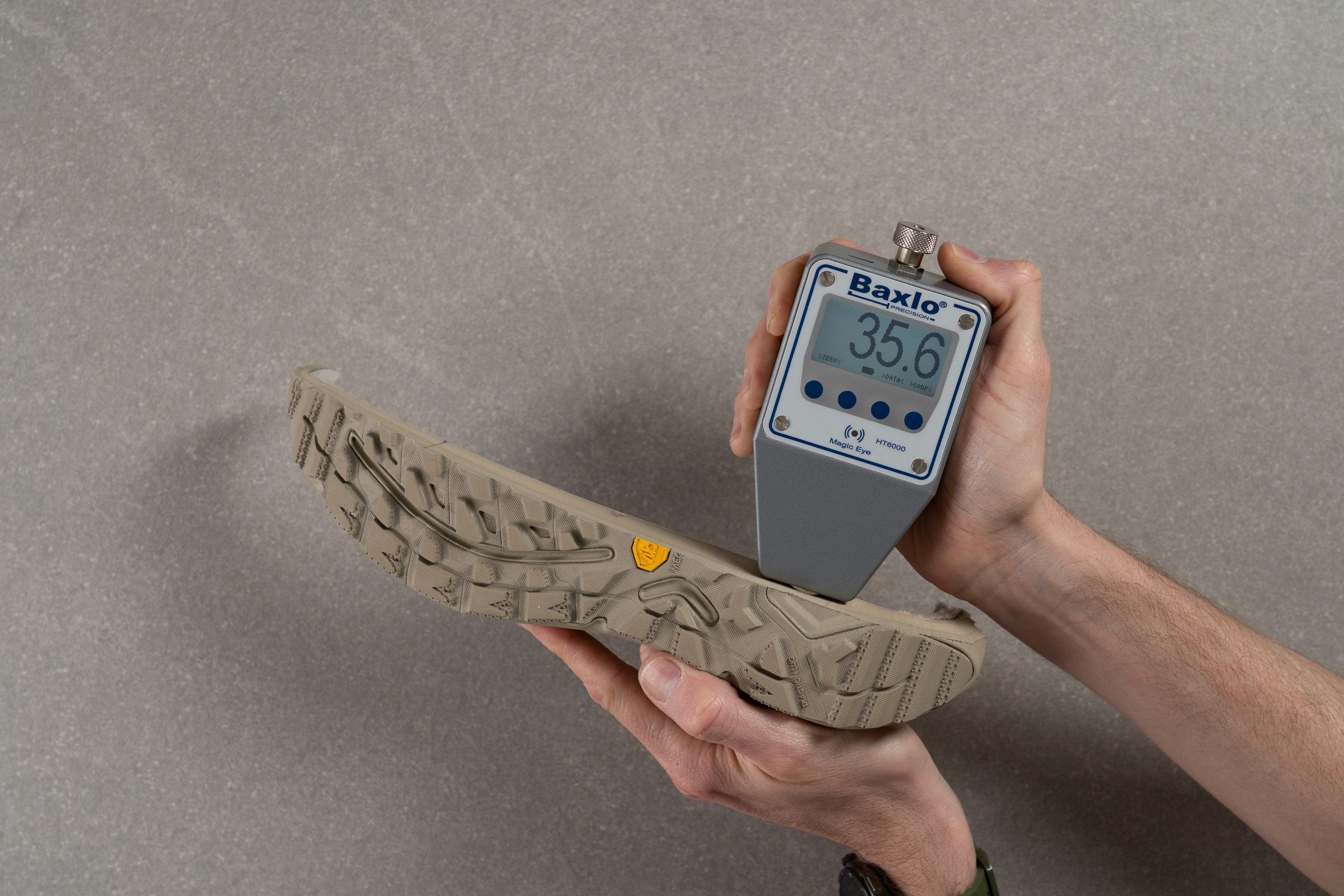 Testing the durability of the outsole on hiking boots: the shallower the dent, the more durable the outsole