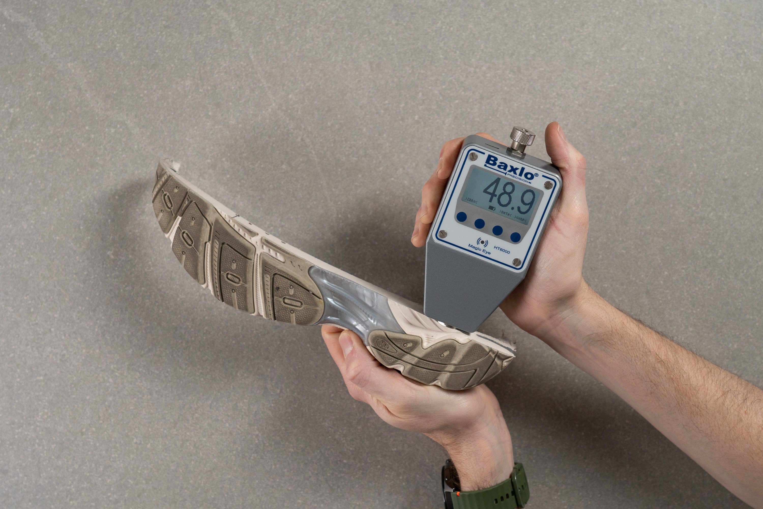 To measure the softness, we use an Asker C durometer, and we stick its needle into the raw foam. For this, obviously, the sneaker has to be cut in half.