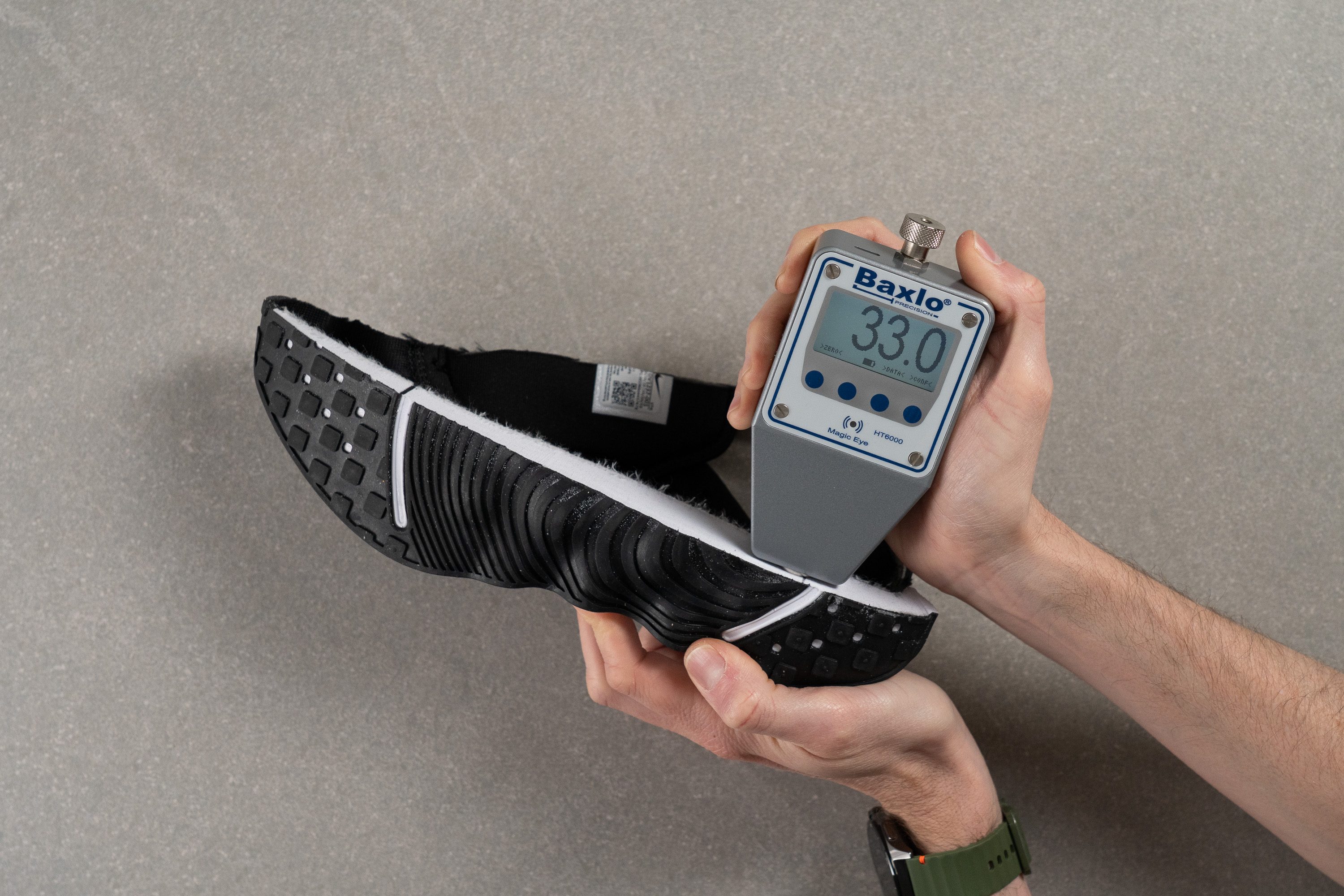 But how do you know if the outsole is durable? In our lab, we measure two parameters to find that out: outsole thickness and its ability to resist high-speed drilling with sandpaper.