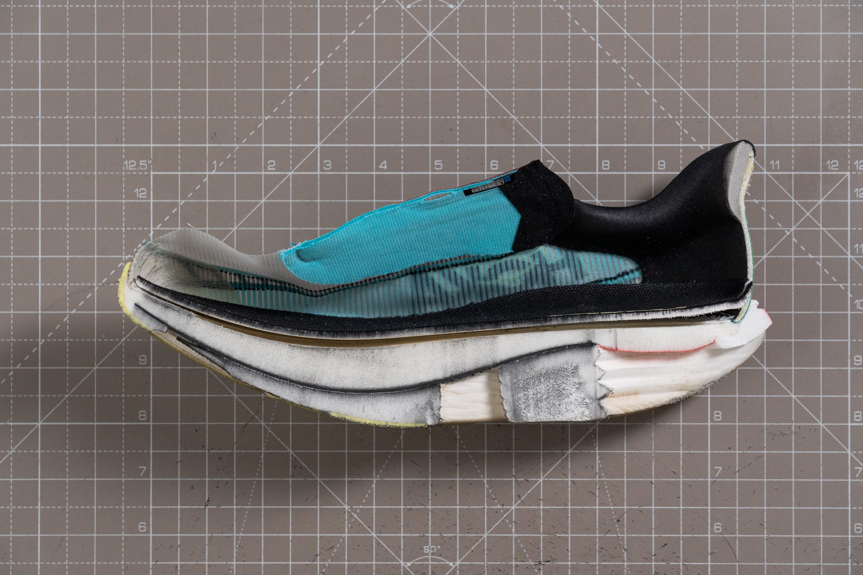 We discovered the brand isn’t measuring at the official point set by World Athletics. Instead, it uses the same loophole Mizuno used in the Wave Rebellion Pro 2—curving the heel in a dramatic way so the measuring spot stays just under 40 mm, while the midfoot packs extra-thick cushioning above that. And it works!