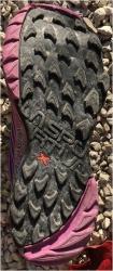 I managed not to fall over today in the pouring rain - thanks to Akasha. As you can see in the picture, the black grippy material covers most of the sole, the purple lugs frame the more wear and tear impact areas at the top (inside) and bottom (outside).