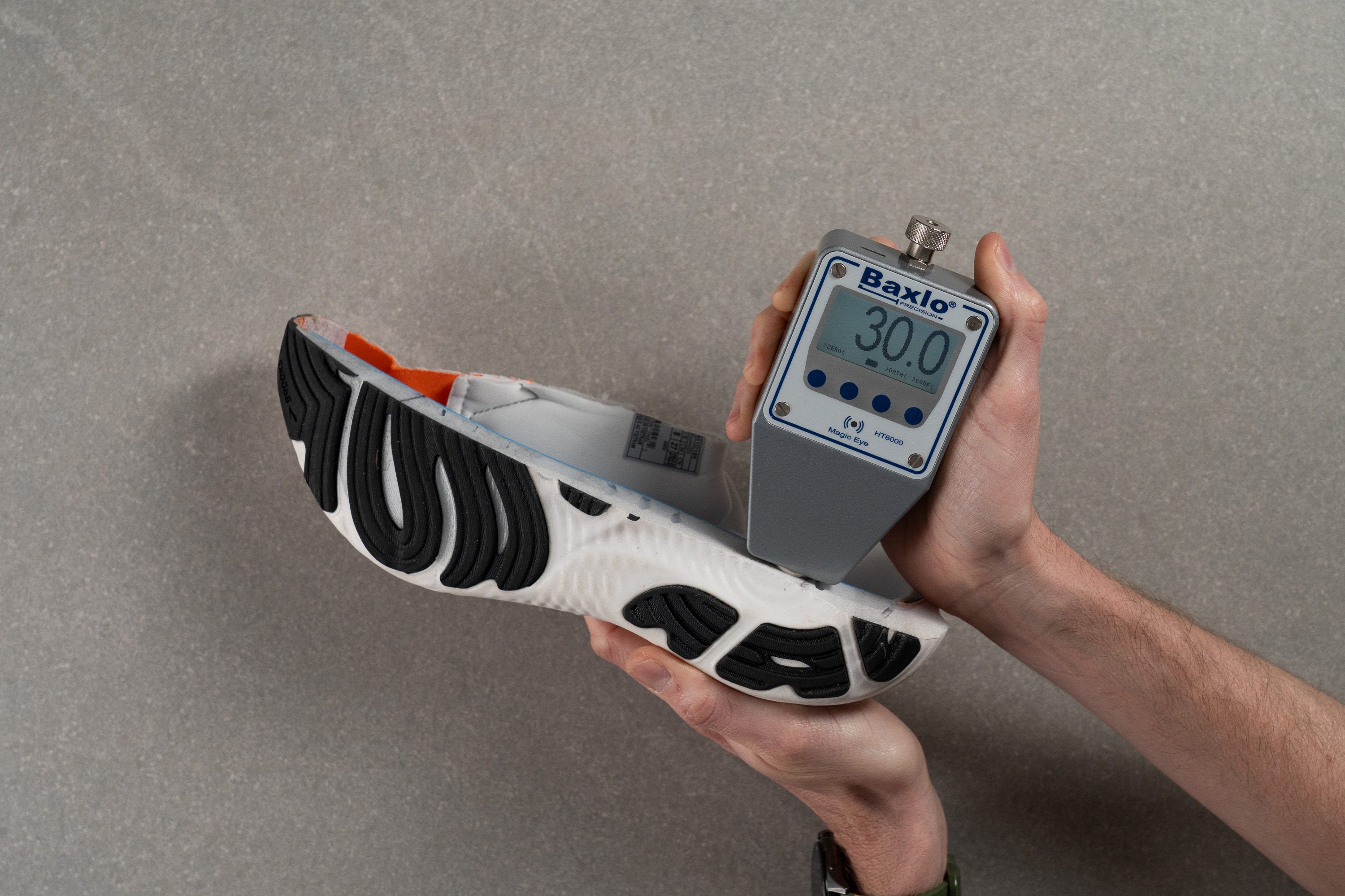 - In our independent shoe testing lab, we literally cut each shoe into pieces and measured every imaginable detail, including shock absorption, energy return, breathability, durability, traction, outsole thickness, tongue thickness, etc.