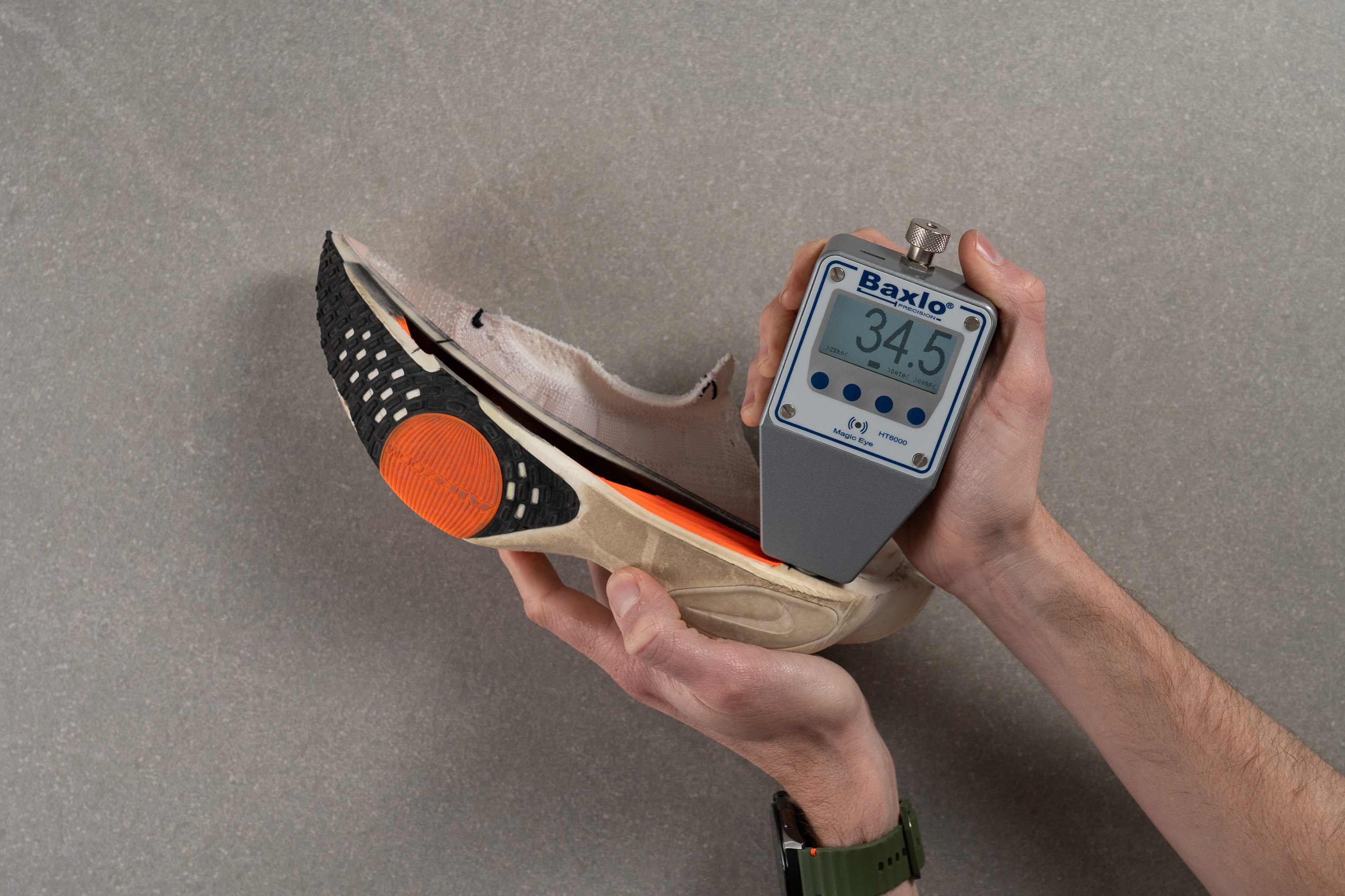 - Bring the shoes to our lab. We cut the race shoes in half and measure different parameters using our tools and equipment. We publish 20+ data points on each shoe, including their energy return, shock absorption, breathability, stiffness, outsole thickness and hardness, weight, and so on.