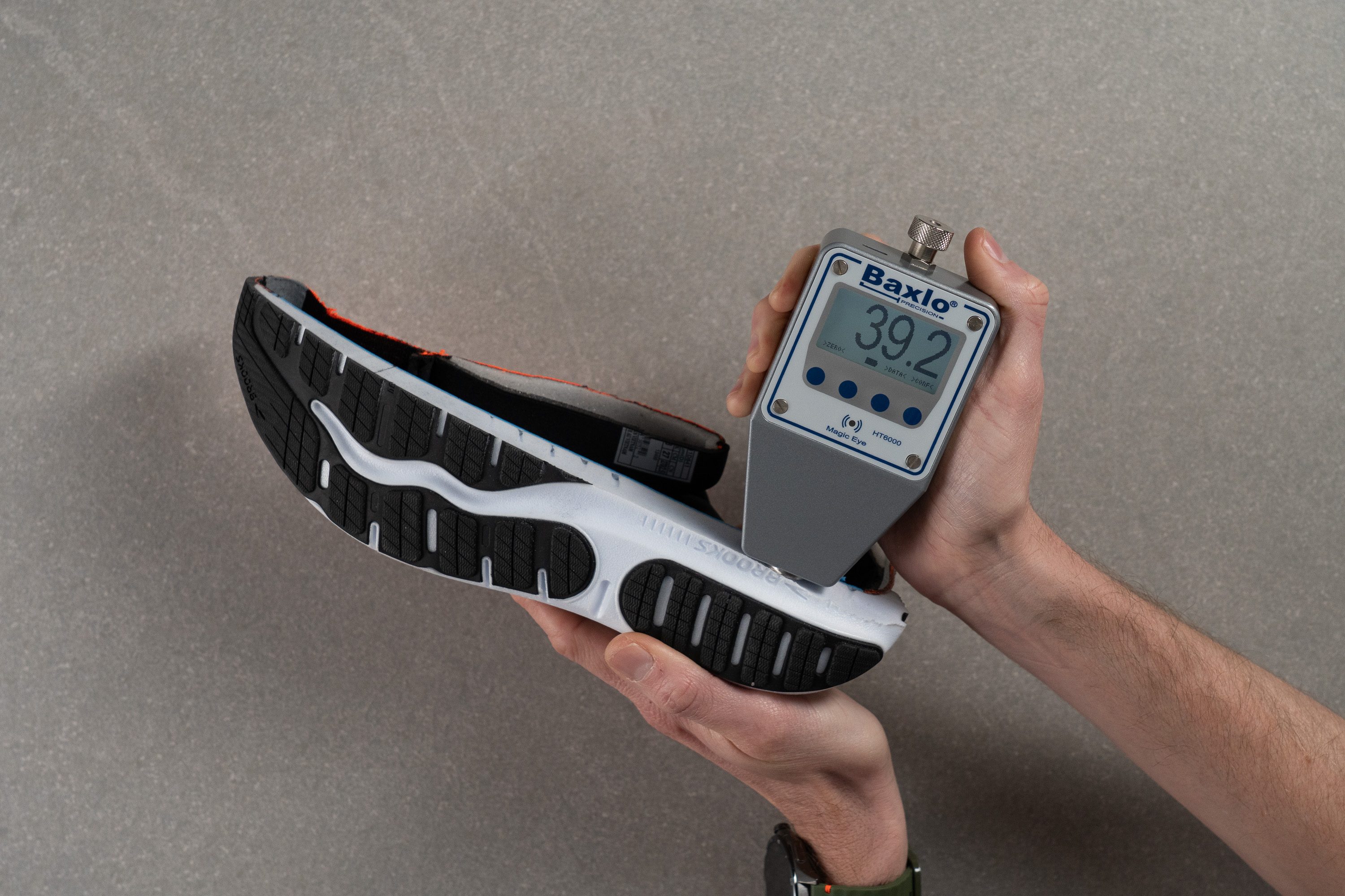 In our lab, we use an Asker C durometer to measure the foam softness of each walking shoe - the lower the AC reading, the softer the foam: