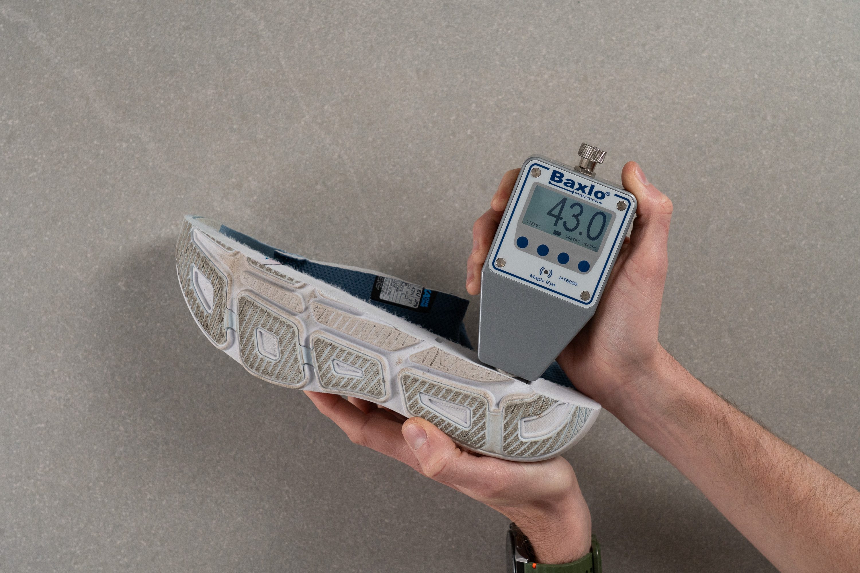 In the lab, we cut all tested shoes in half and measure their foam softness with an AC durometer to find out which walking shoes could be suitable for plantar fasciitis.